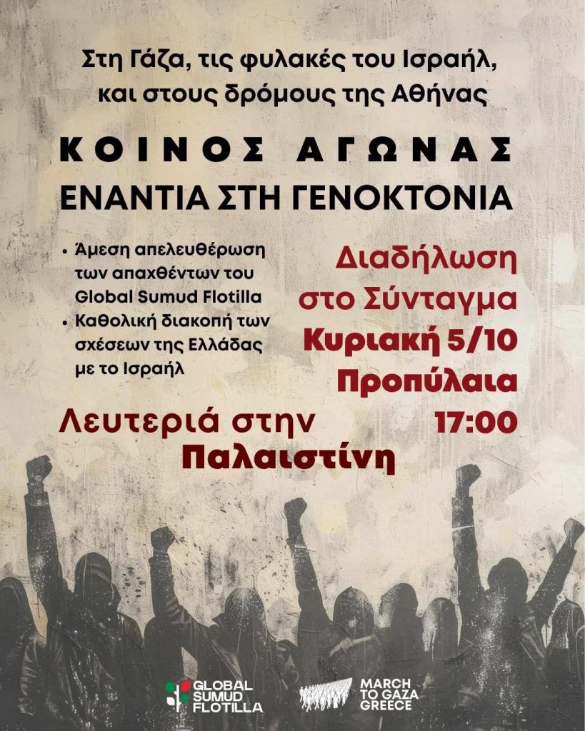Το κράτος τρομοκράτης και εγκληματίας πολέμου του Ισραήλ για άλλη μια φορά καταπατά το διεθνές δίκαιο και επιτίθεται με ένοπλη βία στην ειρηνική διεθνή αποστολή. Έχει την πλήρη κάλυψη ΗΠΑ,ΝΑΤΟ,Ε.Ε και των κυβερνήσεων που παρακολουθούν αμέτοχες και επιτρέπουν την επιχείρηση του Ισραήλ. Το Ισραήλ ως σύγχρονος πειρατής καταλαμβάνει τα πλοία αλληλεγγύης του Global Sumud Flotilla, και συλλαμβάνει τους πολίτες που επιβαίνουν στα σκάφη που μεταφέρουν φαγητό, φάρμακα και κυρίως την ελπίδα της διεθνιστικής αλληλεγγύης και απαίτησης να μπει τέλος στην γενοκτονία του Παλαιστινιακού λαού για Λευτεριά στην Παλαιστίνη.
