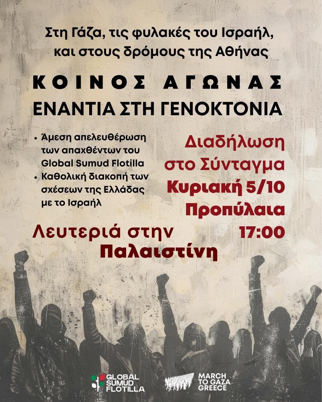 -Να φύγουν τα πολεμικά πλοία του Ισραήλ από τον δρόμο του διεθνή στόλου Global Sumud Flotilla. -Να ανοίξει ο δρόμος για τον ασφαλή ελλιμενισμό των πλοίων στην Γάζα για να παραδοθεί η ανθρωπιστική βοήθεια