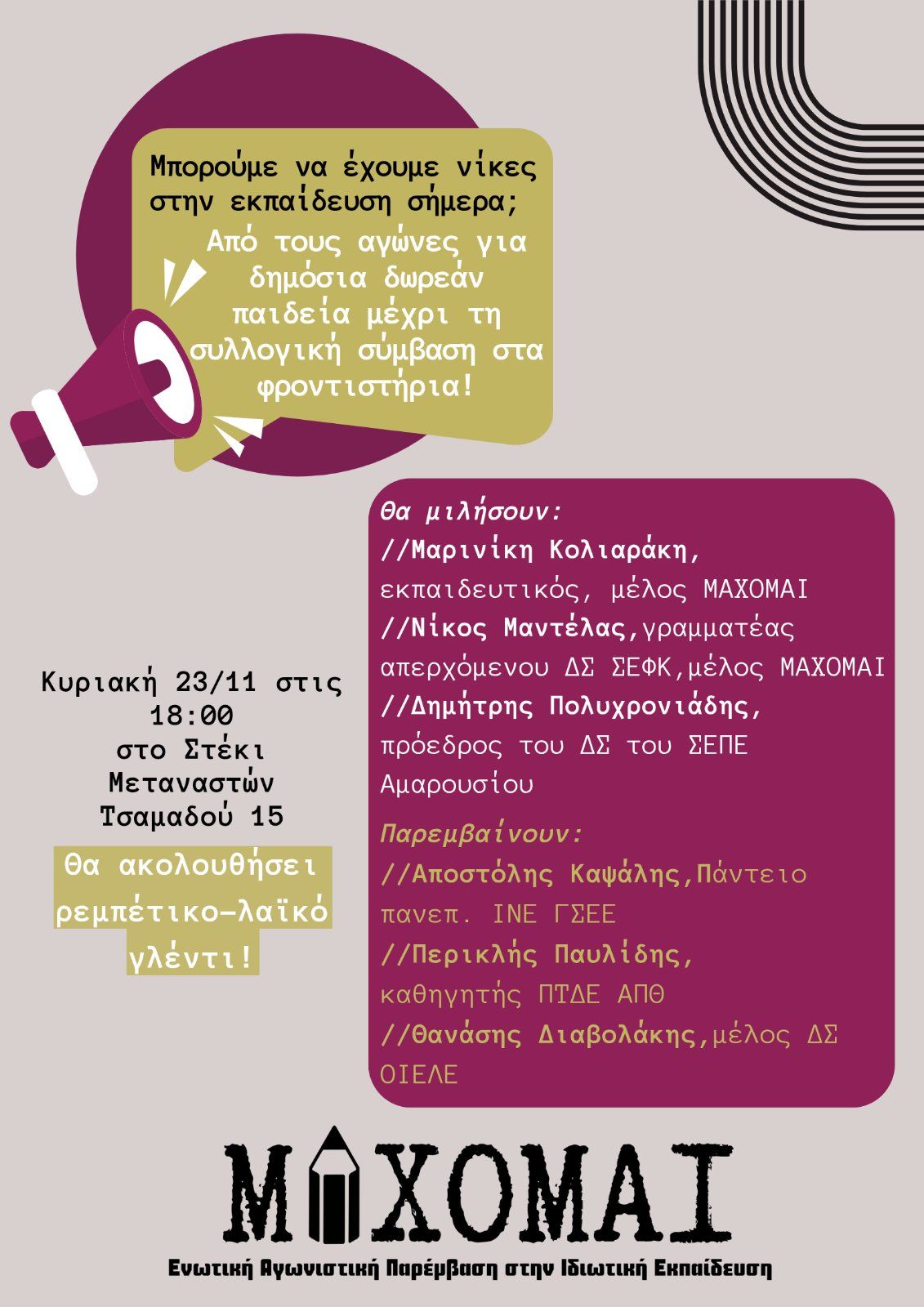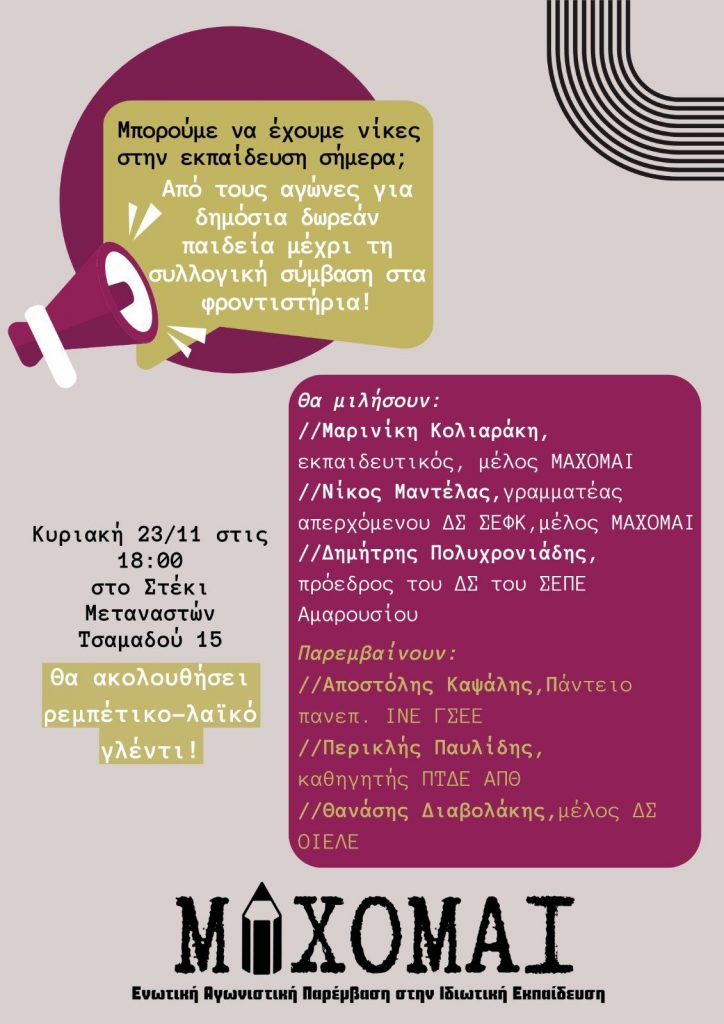 σας καλούμε στην εκδήλωση – συζήτηση που διοργανώνουμε, να γνωριστούμε και να συζητήσουμε για όλα αυτά που μας αφορούν, για να νικήσουμε όλοι και όλες μαζί στη μάχη της παιδείας και της εργασίας.